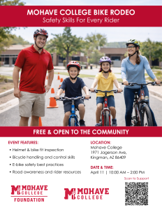 The Mohave College Foundation is excited to support Mohave College’s first Bike Rodeo, a free, community-wide event focused on bicycle and e-bike safety education for riders of all ages. This fun, hands-on event brings students, families, and community members together to build confidence, learn safe riding skills, and promote responsible biking throughout Mohave County.